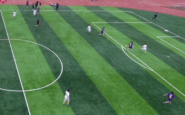 下午3點,比賽開始,兩隊迅速進入狀態(tài),隊員們盡情揮灑汗水,享受著比賽的激情??焖賯髑颍瑠^力拼搶,你來我往攻守頻換,每一次搶斷、射門都會引來全場歡呼。