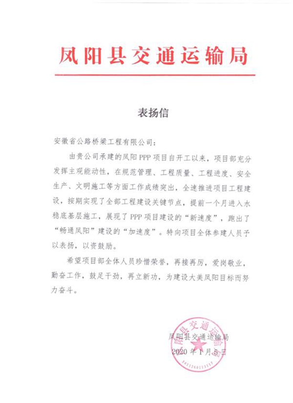 近日,鳳陽縣交通運輸局給公司投資建設(shè)的鳳陽PPP項目發(fā)來表揚信,對項目自開工以來全速推進工程建設(shè),按期實現(xiàn)關(guān)鍵節(jié)點目標,以及在規(guī)范管理、工程質(zhì)量、安全生產(chǎn)等方面所取得的成績給予了贊揚。