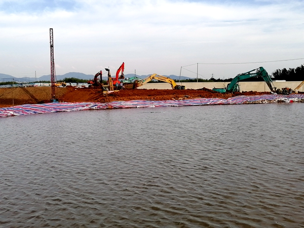 巢湖市東外壞旗山撇洪溝,位于巢湖鼓山腳下,連接清溪河支流,連日降雨,清溪河水位暴漲,防汛壓力巨大,經(jīng)開區(qū)的人民生命和財產(chǎn)安全受到嚴重威脅。經(jīng)巢湖市政府研究決定,在旗山撇洪溝和清溪河支流交匯處筑壩,將撇洪溝東側(cè)低洼處作為清溪河支流泄洪預(yù)備區(qū),以應(yīng)對清溪河水位暴漲危險。接到汛情指令,巢湖市亞父路項目部迅速出動,組建防汛突擊隊,調(diào)集挖掘機、裝載機等機械設(shè)備迅速奔赴搶險一線,連續(xù)奮戰(zhàn)兩天三夜,填筑黃土近10000方,碎石1500方,拋石700噸,圓滿完成了底寬22米,上寬10米,高5米,長110米的筑壩任務(wù),確保了經(jīng)開區(qū)的人民生命和財產(chǎn)安全。