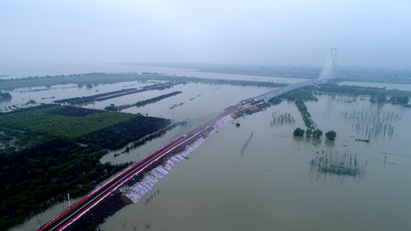 24日,環(huán)巢湖大道杭埠河堤壩上一片忙碌,路橋的抗洪尖兵們要和不斷上漲的湖水搶時(shí)間。從23日凌晨1時(shí)到24日17時(shí),經(jīng)過40多個(gè)小時(shí)的連續(xù)作業(yè),安徽路橋順利完成道路抬升任務(wù),基本具備通行條件。但是為進(jìn)一步提高通行舒適性和道路、堤壩耐久性,突擊隊(duì)伍繼續(xù)戰(zhàn)斗,開始道路水穩(wěn)施工。