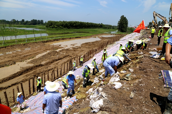 25日7時(shí),市政分公司再次組織400多名職工增援現(xiàn)場。他們中有的是剛從其他抗洪點(diǎn)轉(zhuǎn)戰(zhàn)過來的,有的是主動(dòng)放棄休假時(shí)間請戰(zhàn)過來的,他們的任務(wù)就是完成防浪護(hù)坡工作。隨著一根根木樁打下去、一張張雨布蓋下來、一袋袋沙土堆起來,堤壩變得更加穩(wěn)固。