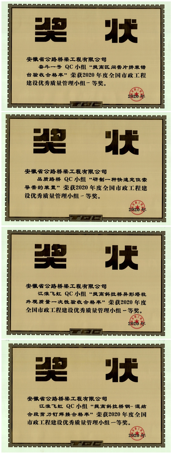 此次全國(guó)市政工程建設(shè)優(yōu)秀QC小組活動(dòng)成果發(fā)布會(huì),共有來(lái)自25個(gè)省、市、自治區(qū)的近770支隊(duì)伍參加。通過(guò)兩天的激烈角逐,市政分公司申報(bào)的《提高區(qū)間管片拼裝錯(cuò)臺(tái)驗(yàn)收合格率》《研制一種快速定位索導(dǎo)管的裝置》《提高特大斜拉橋異型高塔柱外觀質(zhì)量一次性驗(yàn)收合格率》《提高斜拉橋鋼-混結(jié)合段剪力釘焊接合格率》四項(xiàng)QC成果全部獲得一等獎(jiǎng)。