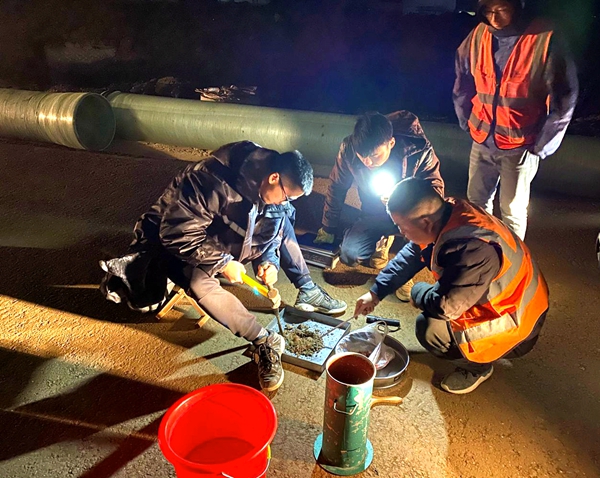 由于該項(xiàng)目施工區(qū)域位于交通干道,車輛、人員流動(dòng)量大,道路兩旁住房、廠房密布,大規(guī)模作業(yè)無法實(shí)施。針對種種困難和壓力,項(xiàng)目部精心謀劃,組織精干力量,分重點(diǎn)、分區(qū)域、分節(jié)點(diǎn),采用“插縫施工”思路,以點(diǎn)帶面,以面促片,順利完成路床交驗(yàn)、路面水穩(wěn)試驗(yàn)段鋪筑、污水管道施工和全線舊路面板破除等節(jié)點(diǎn)任務(wù)。