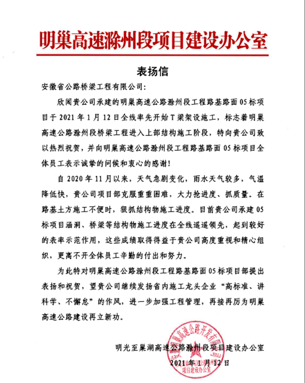 1月12日,明巢高速滁州段項(xiàng)目辦給公司來(lái)信,對(duì)公司承建的明巢高速05標(biāo)在全線(xiàn)率先開(kāi)始T梁架設(shè)進(jìn)行表?yè)P(yáng)。