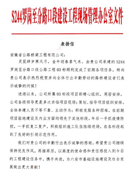 近日,六安市S244羅崗至分路口段建設(shè)工程現(xiàn)場(chǎng)辦發(fā)來表揚(yáng)信,對(duì)公司承建的03標(biāo)項(xiàng)目順利完成前期各項(xiàng)任務(wù)給予高度認(rèn)可并通報(bào)表揚(yáng)。