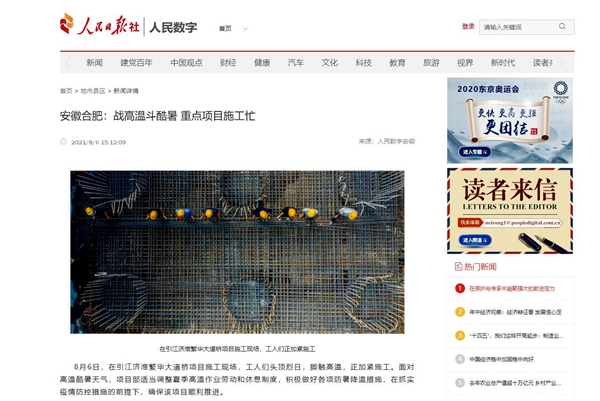8月6日,《人民日報》數(shù)字安徽以《安徽合肥:戰(zhàn)高溫斗酷暑 重點項目施工忙》為題報道了公司承建的引江濟淮繁華大道橋項目建設情況。