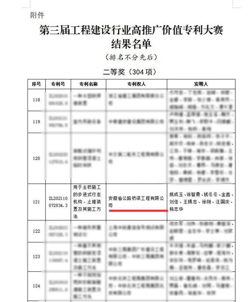 近日,中國施工企業(yè)管理協(xié)會“第三屆工程建設(shè)行業(yè)高推廣價值專利大賽決賽”評選結(jié)果揭曉。由公司報送的《用于主橋施工的步進(jìn)式行走機(jī)構(gòu)、止推裝置及其施工方法》實(shí)用新型專利,在全國2498個參賽項(xiàng)目、19個復(fù)賽項(xiàng)目中脫穎而出,榮獲二等獎,實(shí)現(xiàn)了公司在該類別獎項(xiàng)的新突破。