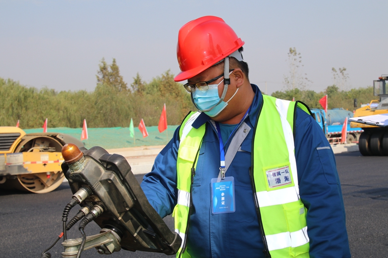 多年來,潘潮在瀝青攤鋪過程中嚴(yán)格規(guī)范瀝青運(yùn)輸、把握攤鋪溫度,任何一個(gè)小細(xì)節(jié)從不放過。面對(duì)兩臺(tái)攤鋪機(jī)同時(shí)施工,在銜接處會(huì)出現(xiàn)“銜接縫”,這不僅破壞路面的美觀,投入使用后可能會(huì)出現(xiàn)斷層情況?!熬髣拧庇珠_始“催化”。在原有工藝基礎(chǔ)上,他通過查找專業(yè)資料,了解其他省份施工工藝,不斷嘗試、不斷探索,保持兩臺(tái)攤鋪機(jī)同時(shí)作業(yè)、同步攤鋪,使銜接的兩塊熨平板高低一致,并在銜接處噴灑熱瀝青,讓攤鋪路面不僅外部美觀,內(nèi)部也能充分融合,治標(biāo)也能治本。