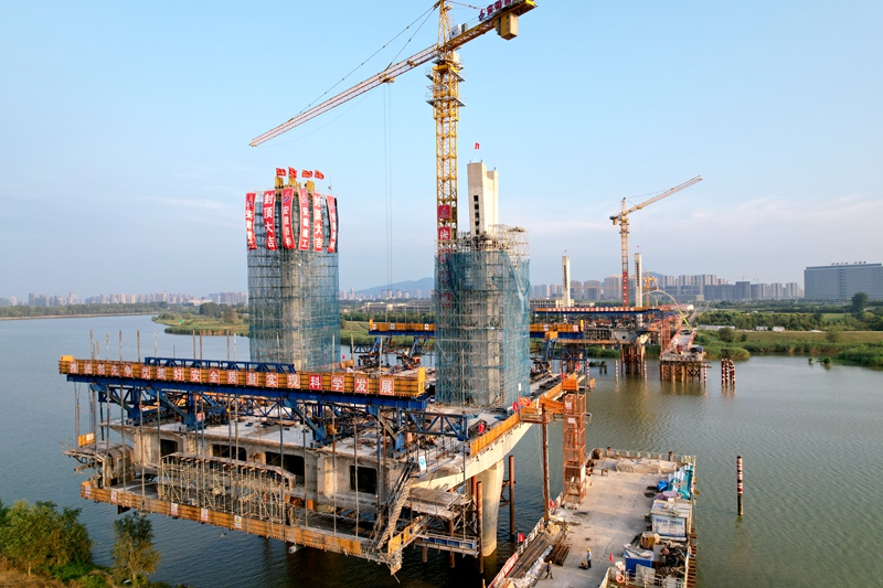 G206-03標渦河八橋主塔全部封頂 發(fā)布時間:2023年09月11日 來源:橋梁分公司 發(fā)布人:黨委工作部 作者:朱柏文 瀏覽:3599次 9月9日,G206-03標項目渦河八橋北岸14#墩左幅主塔順利封頂。至此,大橋南北兩岸4個主塔全部封頂,標志著該項目主橋施工再次取得突破性進展,為后續(xù)的主梁懸澆和斜拉索掛設施工打下了堅實基礎。