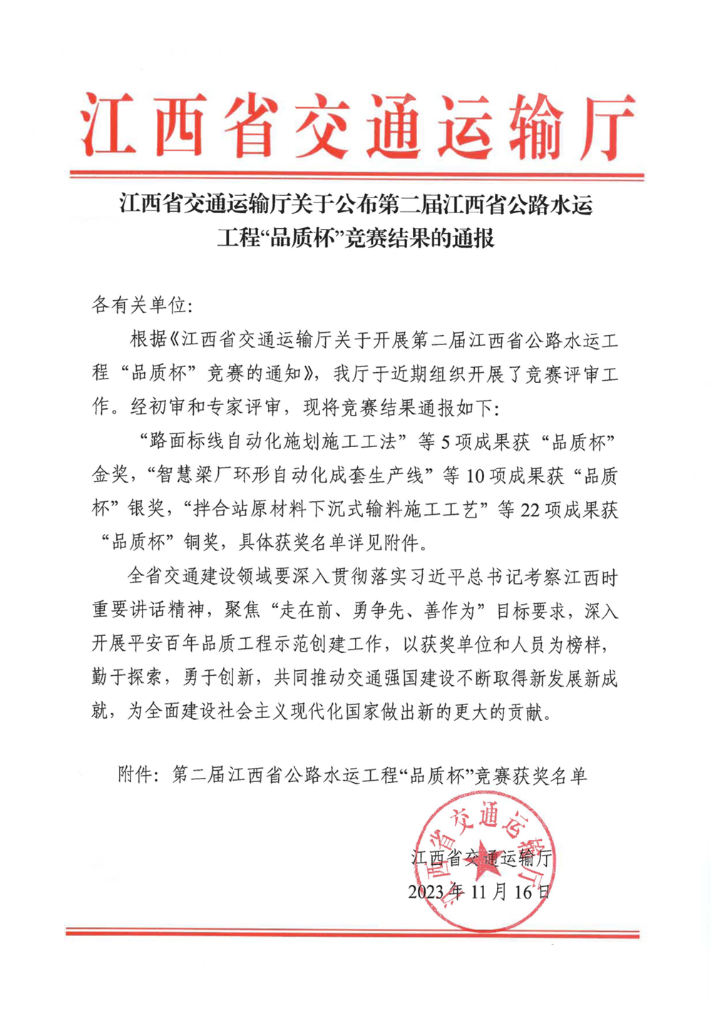 江西省公路水運(yùn)工程“品質(zhì)杯”競(jìng)賽參賽要求嚴(yán)格,競(jìng)爭(zhēng)激烈,是創(chuàng)建江西省平安百年品質(zhì)工程的最高榮譽(yù)。