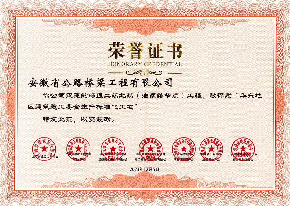 近日,華東地區(qū)建筑安全聯(lián)誼會(huì)公布2023年度華東地區(qū)建筑施工安全生產(chǎn)標(biāo)準(zhǔn)化工地名單,公司承建的暢通二環(huán)北環(huán)(淮南路節(jié)點(diǎn))工程項(xiàng)目光榮上榜。