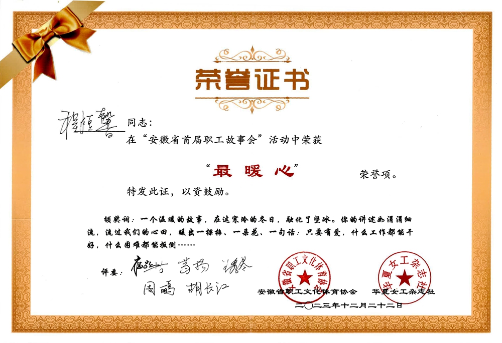 12月22日上午,由安徽省職工文體協(xié)會(huì)、華夏女工雜志社主辦,安徽省職工演講聯(lián)合會(huì)協(xié)辦的“講好職工故事·建設(shè)美好安徽——安徽省首屆職工故事會(huì)”決賽在合肥順利舉辦,由公司選送的選手程煜馨講述的《人生信條-橋柱子》在決賽21個(gè)作品中脫穎而出,代表公司斬獲“安徽省職工故事會(huì)·最暖心”獎(jiǎng)。
