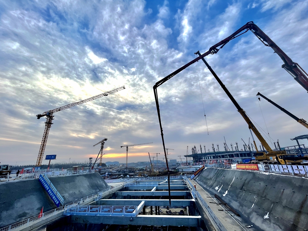 12月23日下午,合肥新橋國(guó)際機(jī)場(chǎng)綜合交通中心項(xiàng)目歷經(jīng)約10小時(shí)的鏖戰(zhàn),圓滿完成項(xiàng)目地鐵S1線首塊底板澆筑。