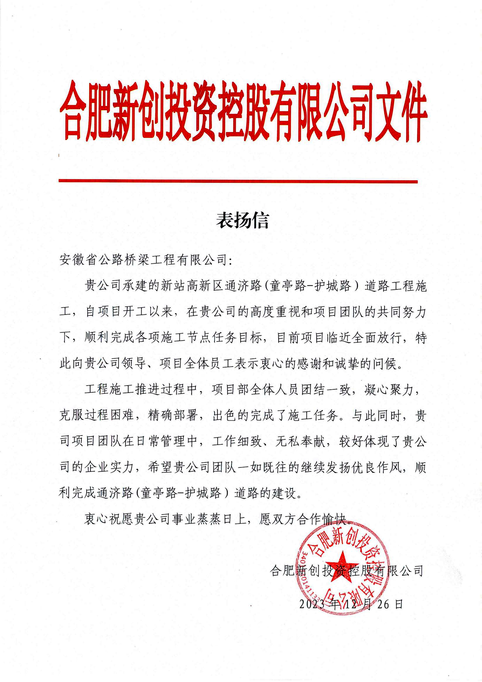 合肥新創(chuàng)投資控股有限公司來信表示,新站高新區(qū)通濟(jì)路(童亭路-護(hù)城路)道路工程施工推進(jìn)過程中,項(xiàng)目團(tuán)隊(duì)發(fā)揚(yáng)路橋鐵軍優(yōu)良作風(fēng),咬定目標(biāo)攻堅(jiān)克難,持續(xù)加強(qiáng)現(xiàn)場(chǎng)安全文明施工和質(zhì)量管理,圓滿完成各項(xiàng)施工任務(wù),彰顯了國(guó)企腳踏實(shí)地、久久為功的擔(dān)當(dāng)作風(fēng)。