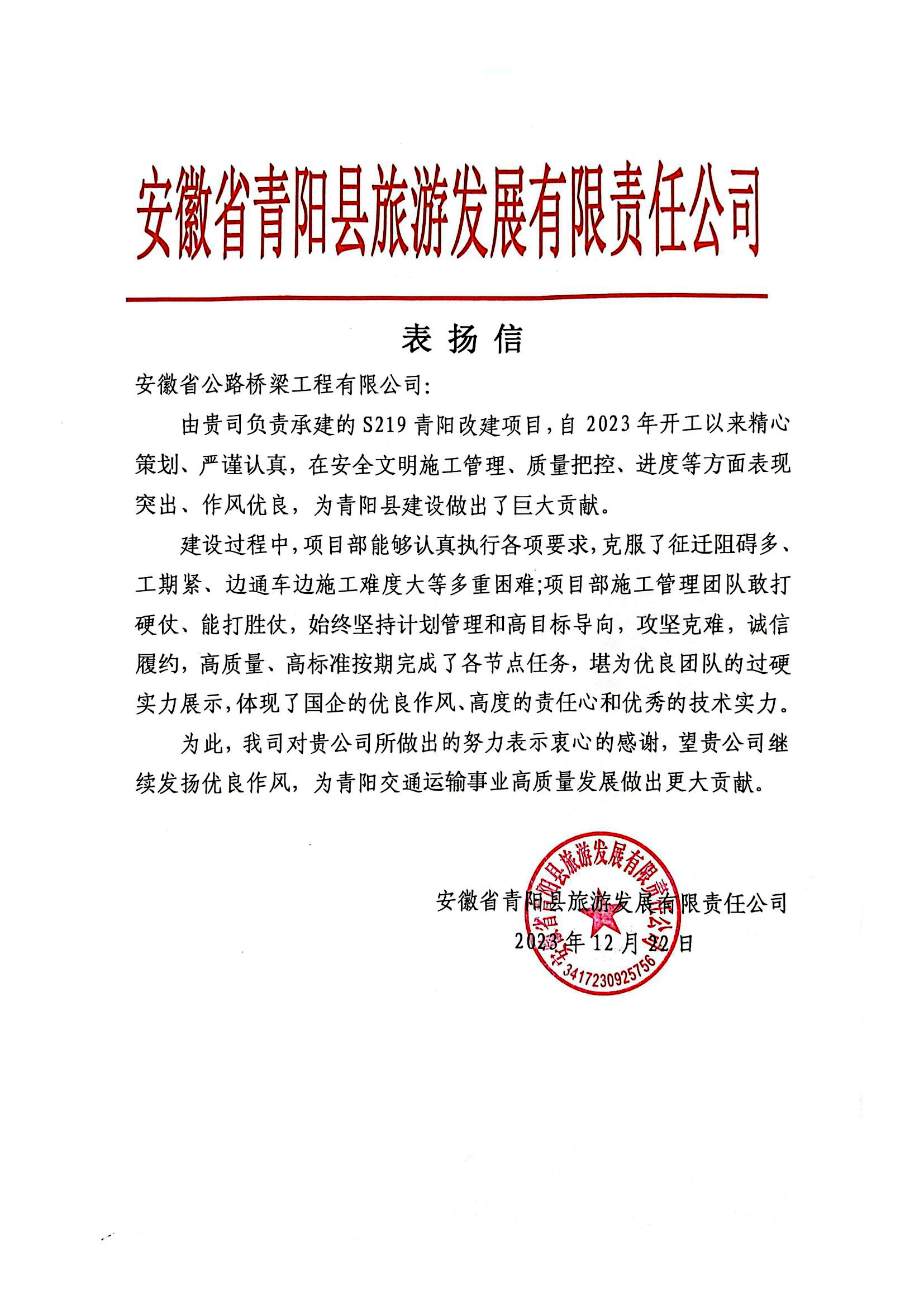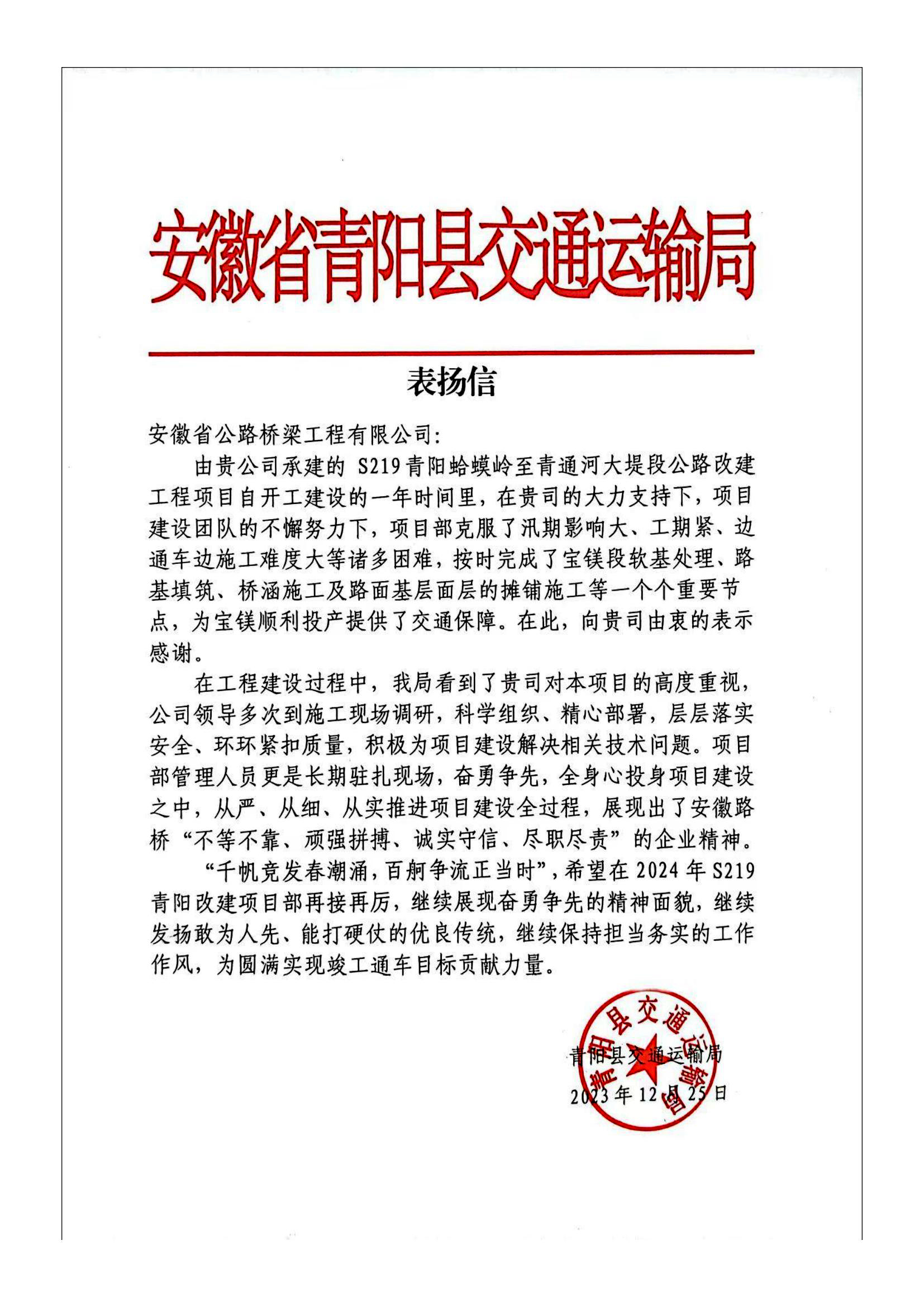 安徽省青陽縣交通運(yùn)輸局和青陽縣旅游發(fā)展有限公司來信指出,S219青陽蛤蟆嶺至青通河大堤段公路改建工程項(xiàng)目建設(shè)過程中,項(xiàng)目施工管理團(tuán)隊(duì)克服了汛期影響大、工期緊、邊通車邊施工難度大等諸多困難,高質(zhì)量、高標(biāo)準(zhǔn)按期完成了各節(jié)點(diǎn)任務(wù),為青陽交通運(yùn)輸事業(yè)高質(zhì)量發(fā)展做出了巨大貢獻(xiàn)。