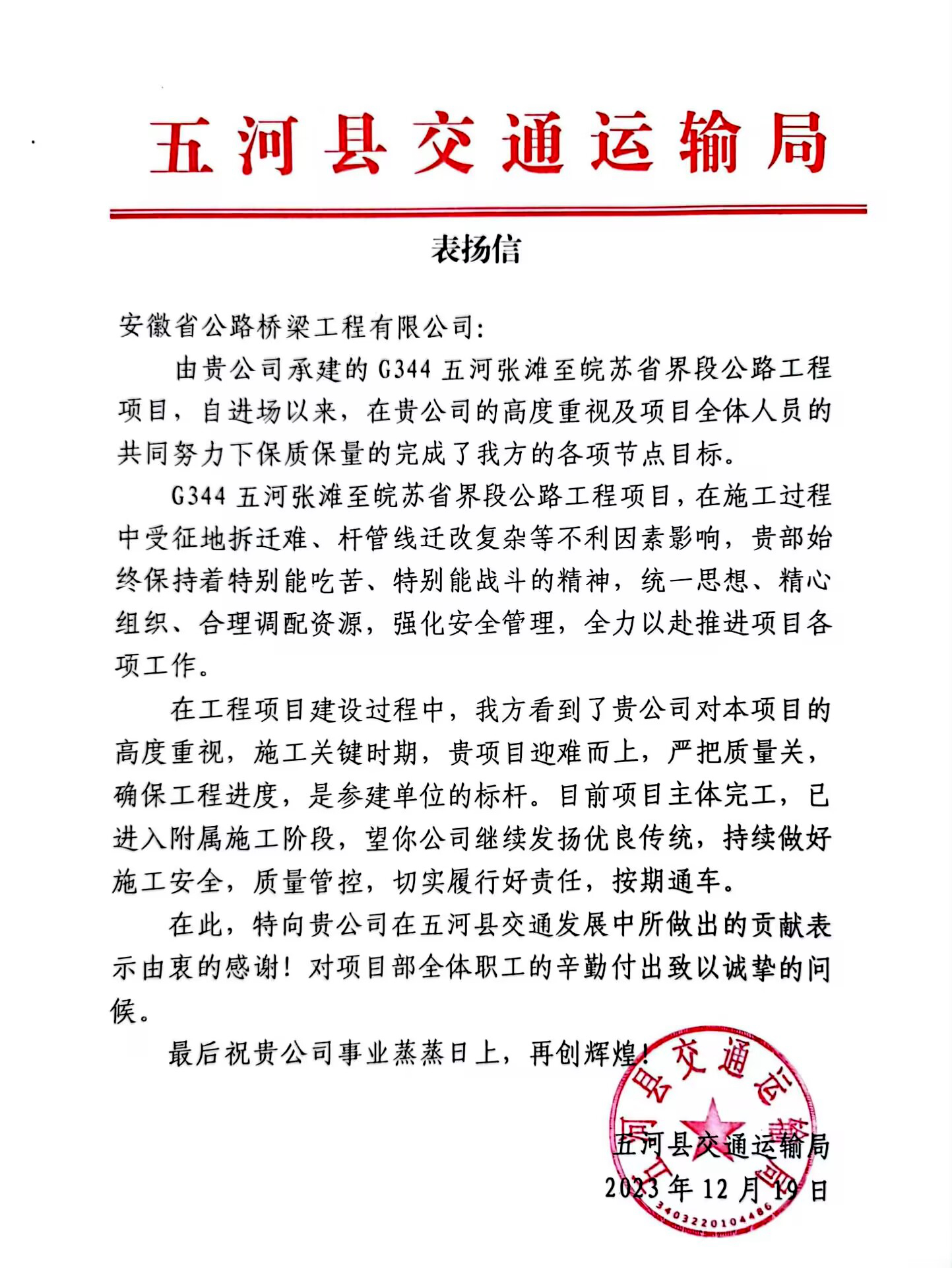 五河縣交通運(yùn)輸局來信指出,G344五河張灘至皖蘇省界段公路工程自進(jìn)場(chǎng)以來,項(xiàng)目全體參建人員統(tǒng)一思想、精心組織、合理調(diào)配資源,克服了征地拆遷難、桿管線遷改復(fù)雜等不利因素影響,保質(zhì)保量地完成了各項(xiàng)節(jié)點(diǎn)目標(biāo),是全線參建單位的標(biāo)桿。