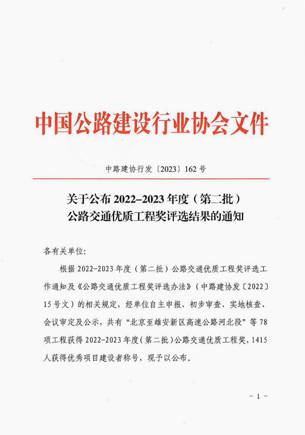 近日,中國公路建設行業(yè)協會公布2022~2023年度(第二批)公路交通優(yōu)質工程獎(李春獎)名單,公司參建的滁州至淮南高速公路定遠至長豐段、銅陵市G347普濟圩至樅陽段改建工程2個項目榜上有名。截至目前,公司已摘得12項“李春獎”。