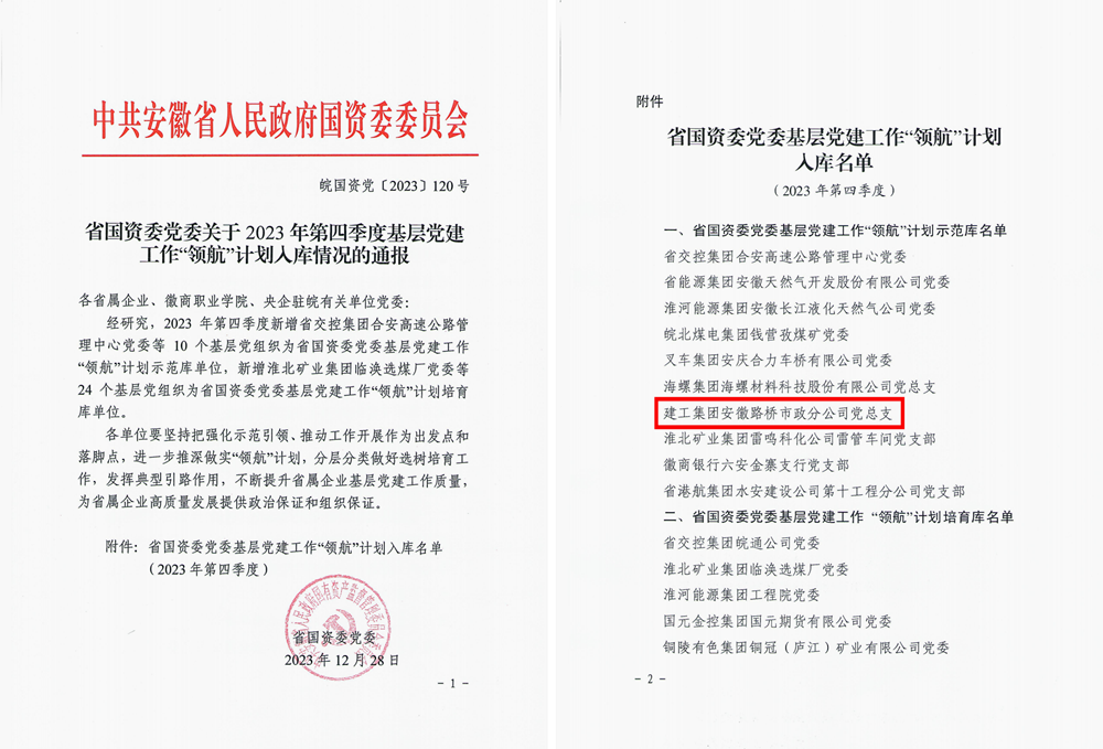 近日,安徽省國資委發(fā)布《關(guān)于2023年第四季度基層黨建工作“領(lǐng)航”計(jì)劃入庫情況的通報(bào)》,安徽路橋市政分公司黨總支成功入選省國資委黨委基層黨建工作“領(lǐng)航”計(jì)劃示范庫。