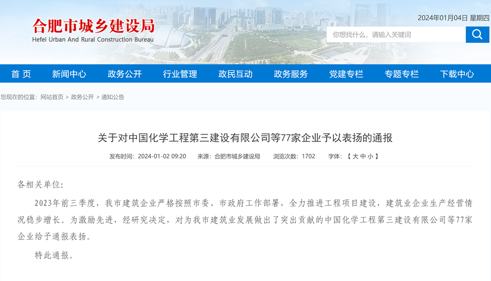 公司獲合肥市城鄉(xiāng)建設(shè)局通報表揚