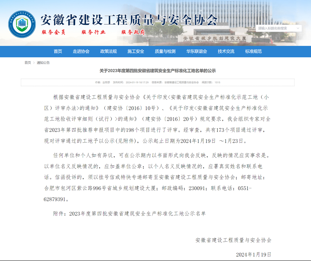 公司一批項(xiàng)目獲評(píng)“安徽省建筑安全生產(chǎn)標(biāo)準(zhǔn)化工地”