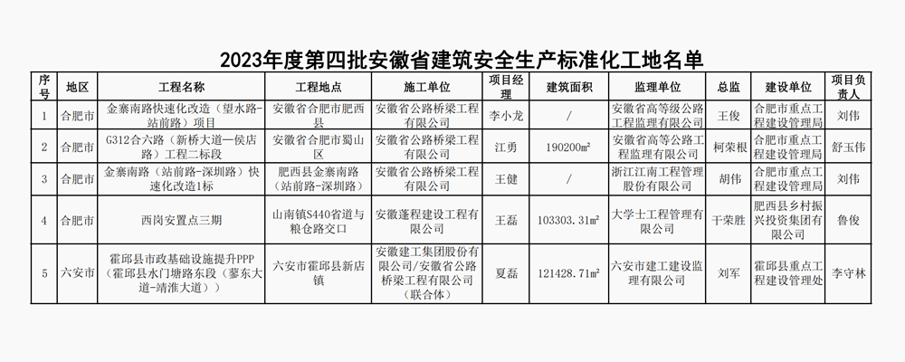 近日,安徽省建設(shè)工程質(zhì)量與安全協(xié)會(huì)公布2023年度第四批安徽省建筑安全生產(chǎn)標(biāo)準(zhǔn)化工地名單,由公司承建的金寨南路快速化改造(望水路-站前路)項(xiàng)目、G312合六路(新橋大道-侯店路)工程二標(biāo)段、金寨南路(站前路-深圳路)快速化改造1標(biāo)、霍邱縣市政基礎(chǔ)設(shè)施提升PPP(霍邱縣水門塘路東段(蓼東大道-靖淮大道))、肥西文旅西崗安置點(diǎn)三期等5個(gè)項(xiàng)目光榮上榜。