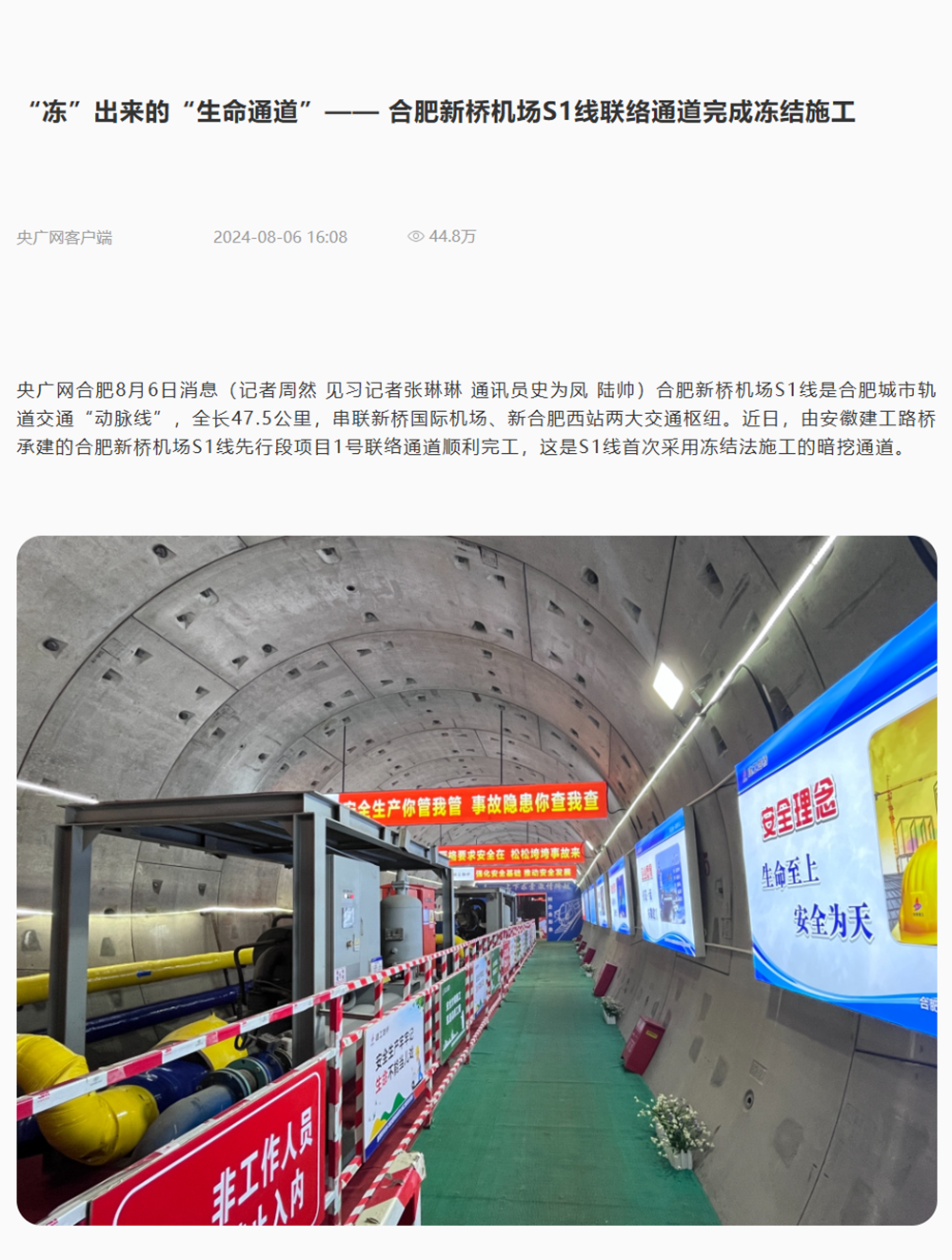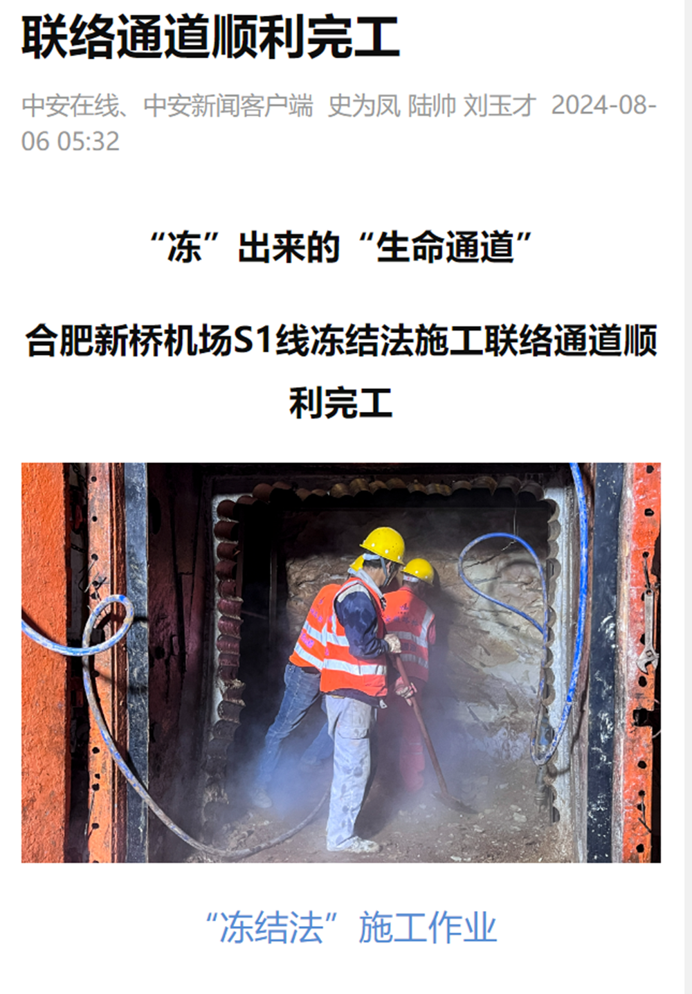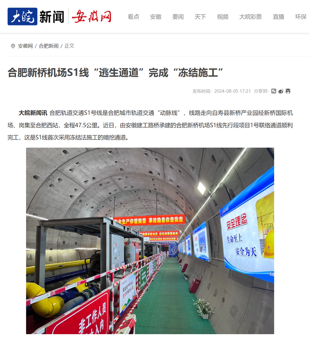 【名媒聚焦】央廣網(wǎng)、中安在線、大皖新聞:“凍”出來的“生命通道”——合肥新橋機(jī)場S1線凍結(jié)法施工聯(lián)絡(luò)通道順利完工