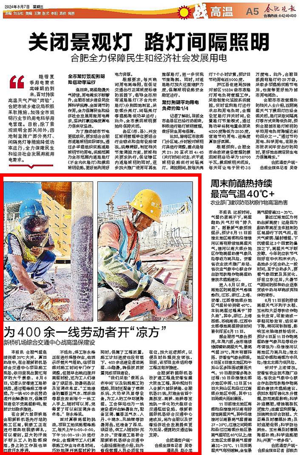 近日合肥氣溫連續(xù)突破35℃大關(guān)。安徽新聞聯(lián)播、安徽日?qǐng)?bào)、合肥晚報(bào)等多家省市主流媒體深入報(bào)道安徽建工路橋合肥新橋國(guó)際機(jī)場(chǎng)綜合交通中心項(xiàng)目戰(zhàn)高溫、保生產(chǎn)。項(xiàng)目開出解暑良方,采取錯(cuò)時(shí)施工、在作業(yè)區(qū)增設(shè)工業(yè)風(fēng)扇等措施,保障高溫天氣下勞動(dòng)者生命安全和身體健康,確保這一重點(diǎn)工程建設(shè)的生產(chǎn)進(jìn)度,保障項(xiàng)目建設(shè)不受高溫影響穩(wěn)步推進(jìn)。
