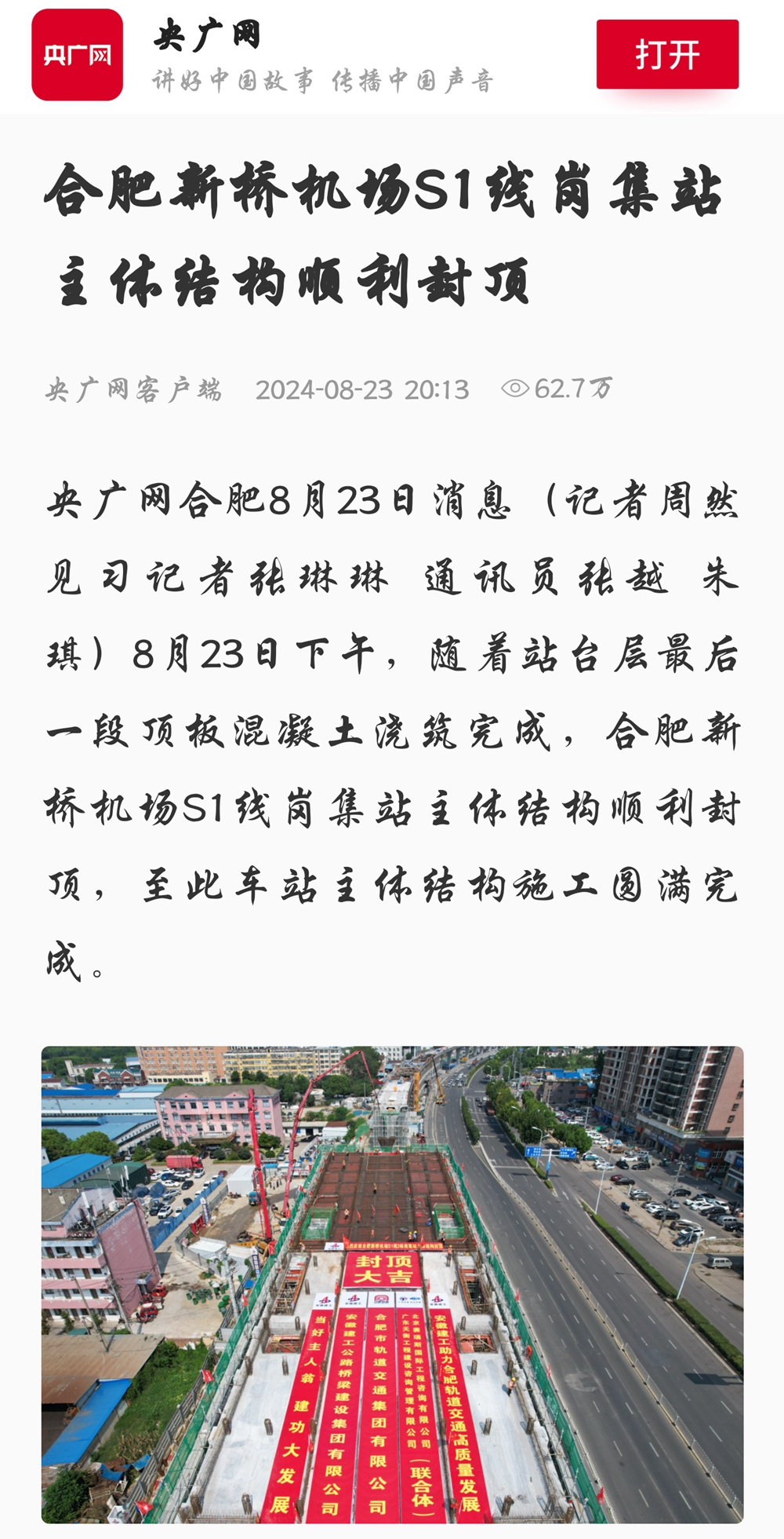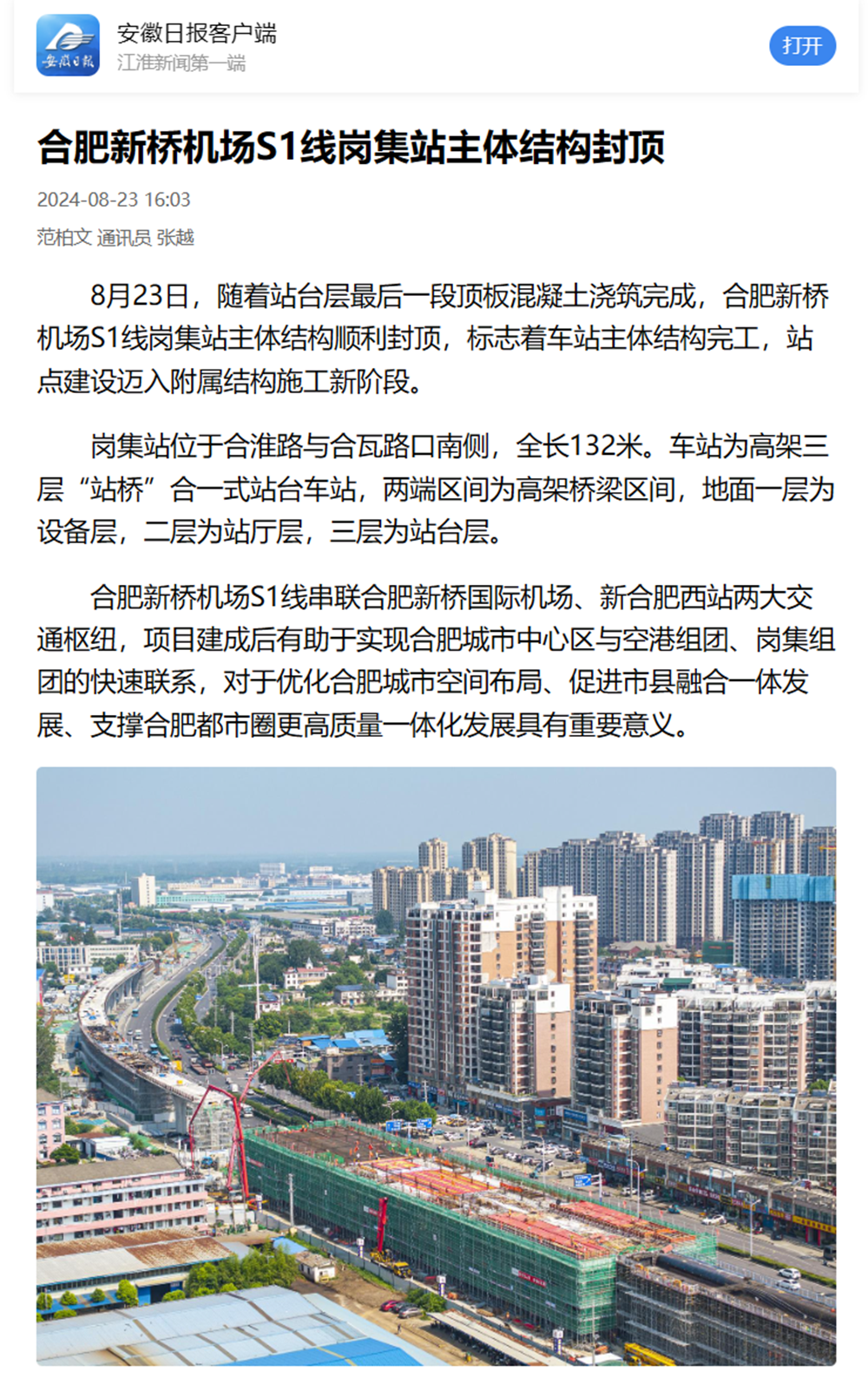 【名媒聚焦】央廣網、中安在線、安徽日報等主流媒體聚焦合肥新橋機場S1線項目崗集站主體結構封頂