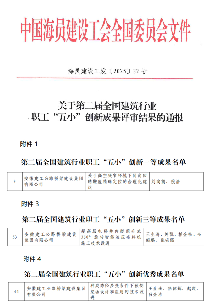 近日,第二屆全國建筑行業(yè)職工“五小”創(chuàng)新成果競賽落下帷幕,公司申報的三項成果從全國372項參賽作品中脫穎而出,斬獲1項一等成果、1項三等成果和1項優(yōu)秀成果,彰顯了企業(yè)一線職工的創(chuàng)新智慧與活力。