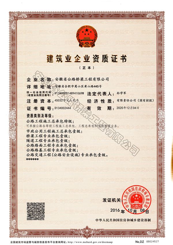 近日,住房和城鄉(xiāng)建設(shè)部發(fā)布公告,公司特級(jí)資質(zhì)順利獲批,成為安徽省內(nèi)首家也是唯一一家同時(shí)擁有公路工程施工總承包特級(jí)資質(zhì)和公路行業(yè)工程設(shè)計(jì)甲級(jí)資質(zhì)的企業(yè)。