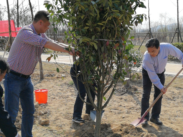 在植樹活動現(xiàn)場,信長星與項目負責(zé)人共同植下第一棵樹,同時給大家講解了一些植樹的技巧和注意事項。