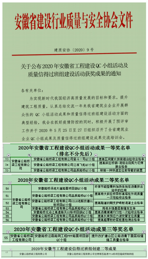 6月4日,安徽省建筑質(zhì)量與安全協(xié)會公布了2020年安徽省工程建設(shè)QC小組活動及質(zhì)量信得過班組建設(shè)活動獲獎成果名單。公司QC小組申報的《提高區(qū)間管片拼裝錯臺驗收合格率》等3項成果榮獲一等獎,《環(huán)保節(jié)能型骨料加熱系統(tǒng)在瀝青拌合站中的應(yīng)用》等7項成果榮獲二等獎,《提升改擴建山區(qū)公路瀝青下面層縱縫施工質(zhì)量合格率》榮獲三等獎。同時,甘肅銀百高速TY14標項目箱梁預(yù)制班組榮獲安徽省工程建設(shè)信得過班組創(chuàng)建二等成果。