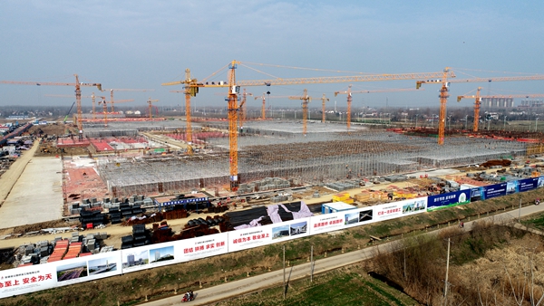 2月12日,農(nóng)歷大年初一,在舒城縣智慧電子小鎮(zhèn)EPC總承包項目施工現(xiàn)場,數(shù)百名工人正在進(jìn)行廠房鋼筋幫扎、支架搭設(shè)。