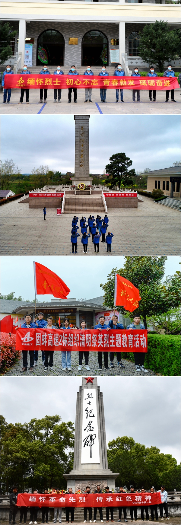 蒙城PPP項(xiàng)目黨支部組織黨員和職工來到蒙城縣革命烈士陵園掃墓祭奠,向革命烈士敬獻(xiàn)花籃,表達(dá)哀思;淮北片區(qū)黨支部組織黨員、團(tuán)員青年和職工瞻仰泗縣烈士陵園,銘記歷史,致敬革命先烈;合肥軌道交通3號(hào)線南延2標(biāo)項(xiàng)目黨支部前往新四軍江北指揮部開展黨史教育,重溫入黨誓詞,牢記初心使命;引江濟(jì)淮聯(lián)合黨支部追尋紅色足跡,在茶壺山烈士陵園紀(jì)念碑前,唱響國歌,靜思默哀;暢通二環(huán)(西南環(huán))項(xiàng)目黨支部組織開展“網(wǎng)上祭英烈”活動(dòng),廣大黨員、團(tuán)員青年和職工登陸網(wǎng)上紀(jì)念館,緬懷革命先烈,表達(dá)對(duì)英雄的敬意。