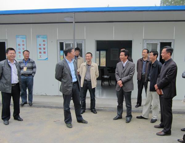 王傳鵬一行先來到我標(biāo)段正在建設(shè)中的預(yù)制場拌合站,并聽取了項目經(jīng)理杜海峰的匯報。接著來到我標(biāo)段項目部,調(diào)研項目駐地建設(shè)情況,就項目駐地建設(shè)作出具體指導(dǎo)。他要求項目駐地的實驗室及相關(guān)配套設(shè)施要盡早完備,并指出在地方事務(wù)上,出現(xiàn)問題要及時與縣指和鄉(xiāng)鎮(zhèn)進行溝通,協(xié)調(diào)解決。同時,他要求縣指繼續(xù)做好各項協(xié)調(diào)工作,確保蚌固路改造工程于10月底順利施工。