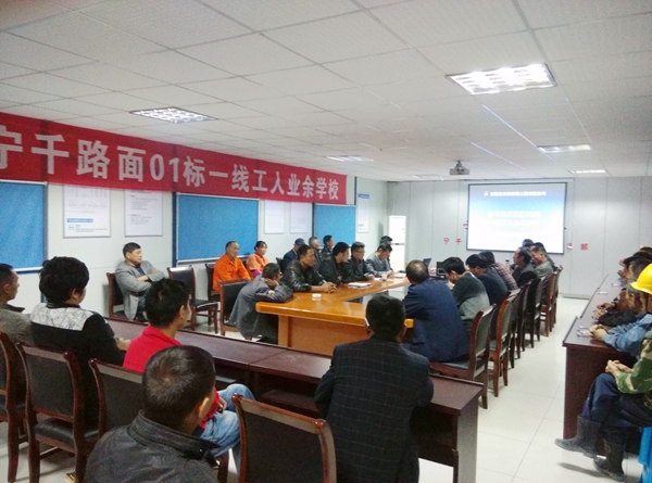 11月4日晚,寧千路面01標(biāo)會議室座無虛席,40余名農(nóng)民工兄弟再一次享受著該項目農(nóng)民工業(yè)余學(xué)校帶來的知識和樂趣。