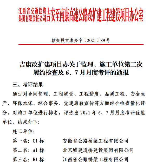 8月8日,吉康改擴(kuò)建項(xiàng)目辦公布了2021年6、7 月考評結(jié)果,公司承建的吉康改擴(kuò)建C1標(biāo)連續(xù)兩個(gè)月獲月度綜合考核第一名。