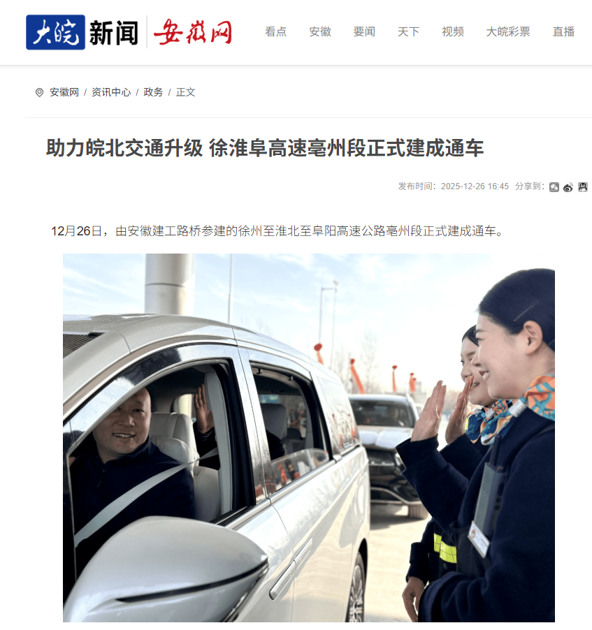 12月26日,由安徽建工路橋參建的徐州至淮北至阜陽高速公路亳州段正式建成通車。