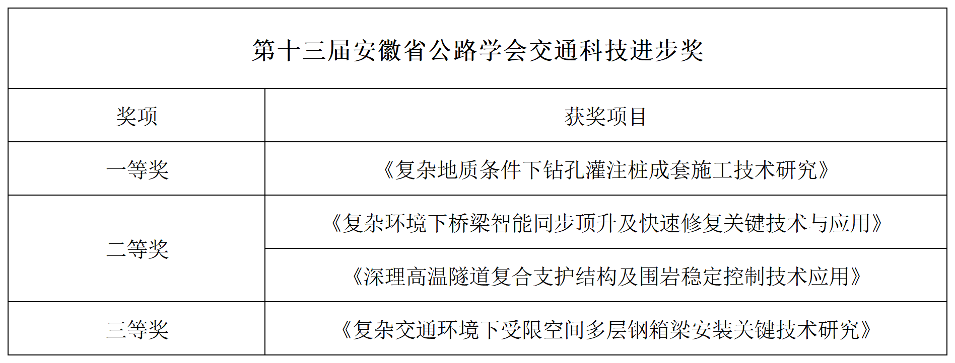 近日,安徽省公路學(xué)會(huì)八屆四次理事會(huì)成功召開,會(huì)議期間,頒發(fā)了第十三屆安徽省公路學(xué)會(huì)交通科技進(jìn)步獎(jiǎng)項(xiàng)目及2025年度先進(jìn)會(huì)員單位。公司申報(bào)的《復(fù)雜地質(zhì)條件下鉆孔灌注樁成套施工技術(shù)研究》等4項(xiàng)研究成果分別榮獲一、二、三等獎(jiǎng),公司再次獲得2025年度先進(jìn)會(huì)員單位稱號(hào)。