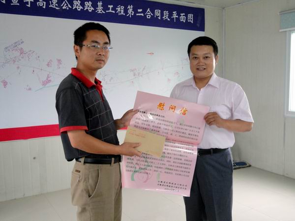 胡主席一行在到達項目部后,首先召集了項目部領(lǐng)導及部分技術(shù)骨干在會議室召開了一個簡單的座談會。會上,胡主席代表公司領(lǐng)導首先對02標項目部的五十多名干部職工傳達了公司領(lǐng)導的關(guān)懷:“季節(jié)特殊,條件艱苦,同志們辛苦了!”隨后,胡主席向王守武總工遞交了總公司工會給宣寧02標項目職工的慰問信及慰問金,總工王守武代表項目部全體員工對總公司的慰問表示感謝。