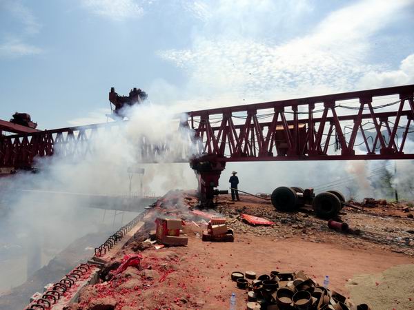 上午10點(diǎn)30分,項(xiàng)目辦、高駐辦等相關(guān)領(lǐng)導(dǎo),在公司總經(jīng)理助理丁世國、項(xiàng)目經(jīng)理羅權(quán)等的陪同下,親臨我盤石分離立交梁板安裝施工現(xiàn)場指導(dǎo)安裝工作。10點(diǎn)40分,架梁工作正式開始,現(xiàn)場頓時(shí)鞭炮齊鳴、禮花綻放。 10點(diǎn)58分,首片梁板順利安裝。
